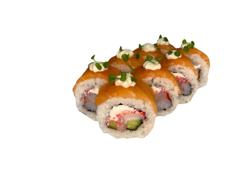 Нори, рис, сливочный сыр, огурец, тигровые креветки, икра масаго красная, лосось, сырная шапочка