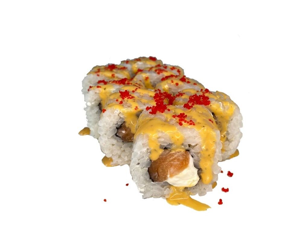 Рис, лист нори, сыр сливочный, сёмга, соус 1000 тысяча островов, икра тобико красная