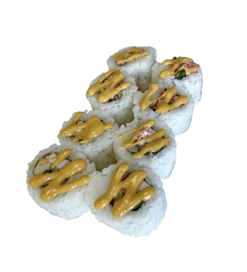 Рис, лист нори, соус лава, огурец, запеченное куриное филе, соус 1000 островов
