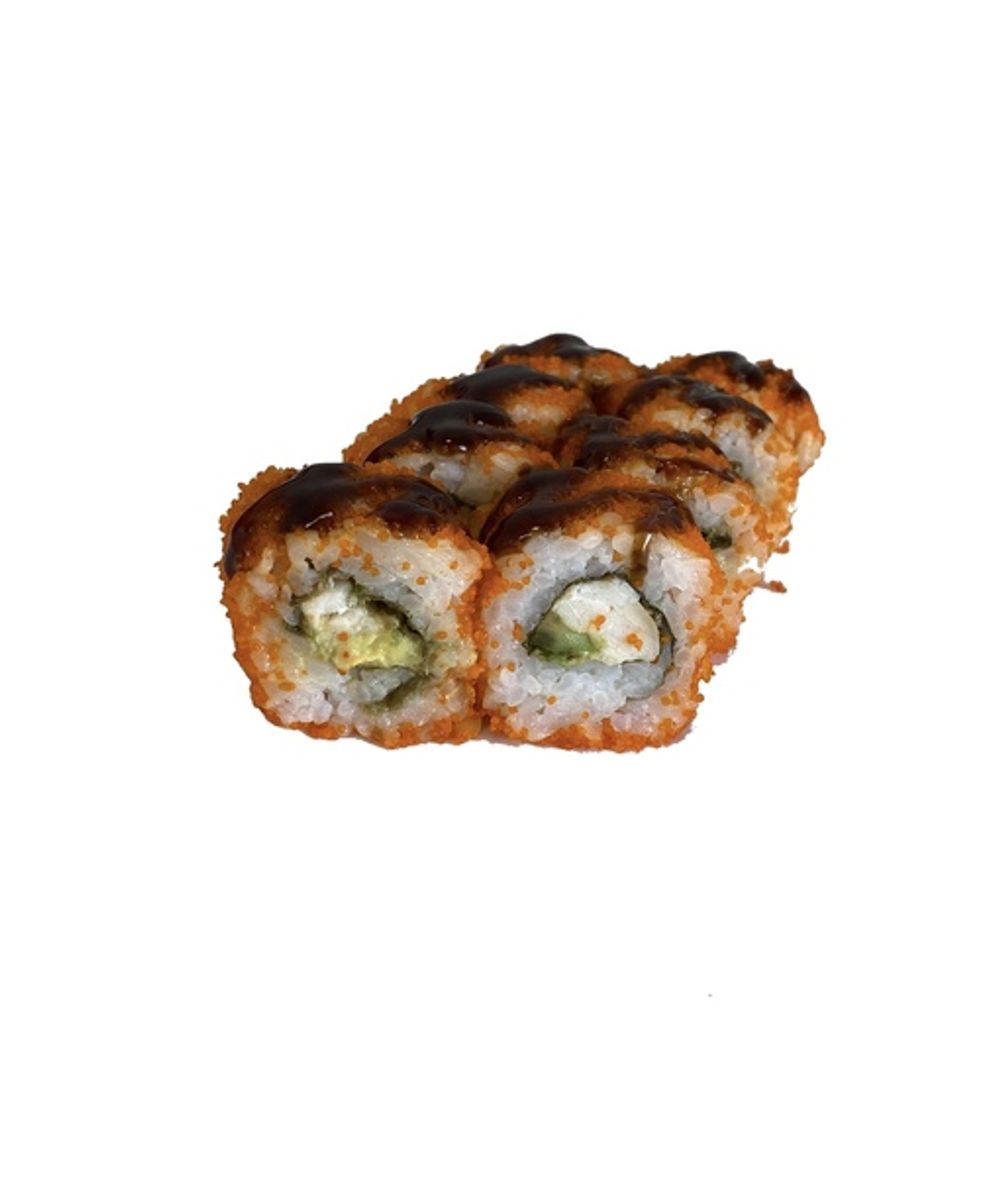 Рис, нори, авокадо, копчённая курица, сливочный сыр, спайси соус, икра тобико оранжевая, соус терияки