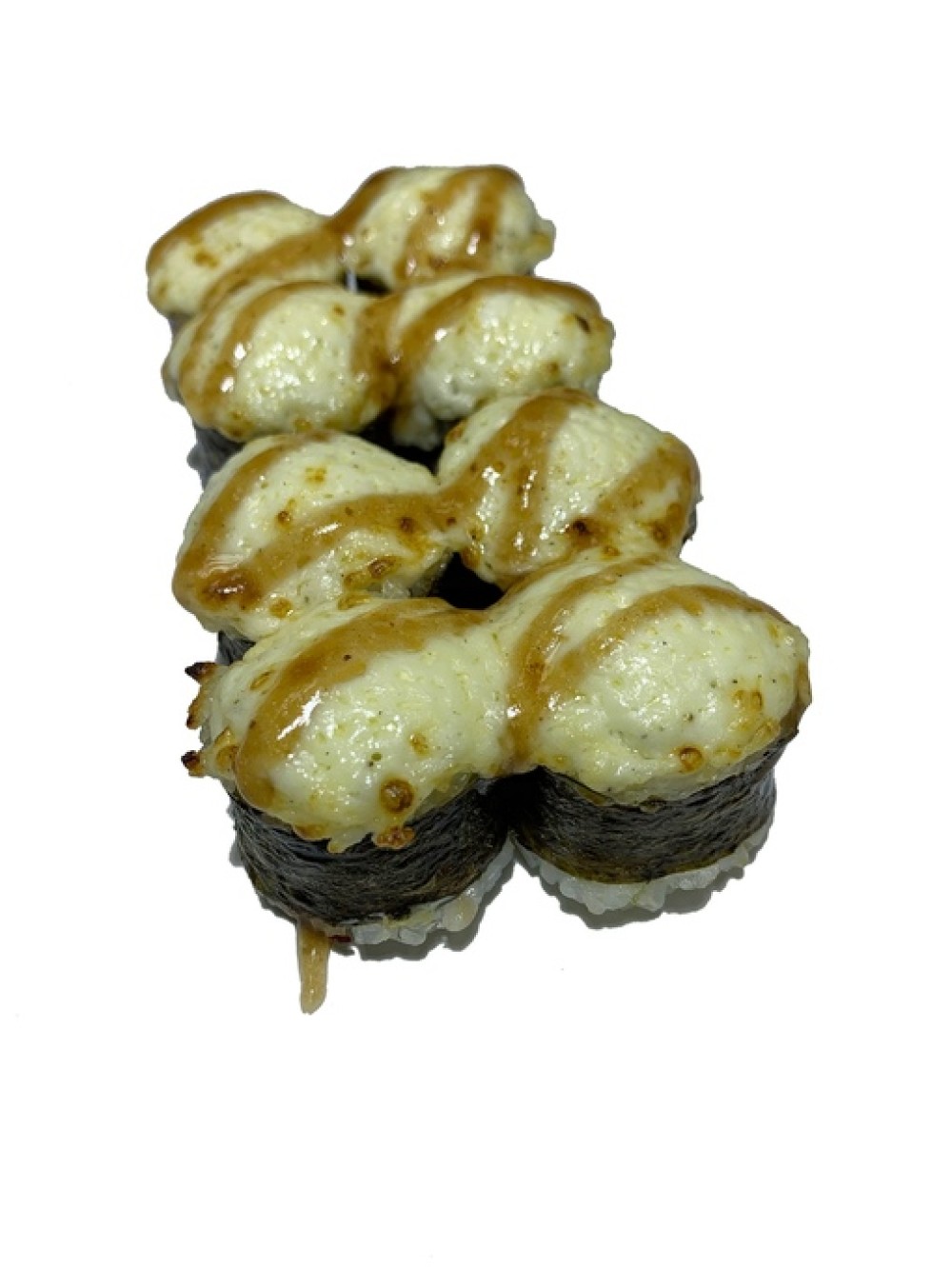 Рис, лист нори, курица копчёная, салат айсберг, сыр сливочный, сырная шапочка, соус терияки
