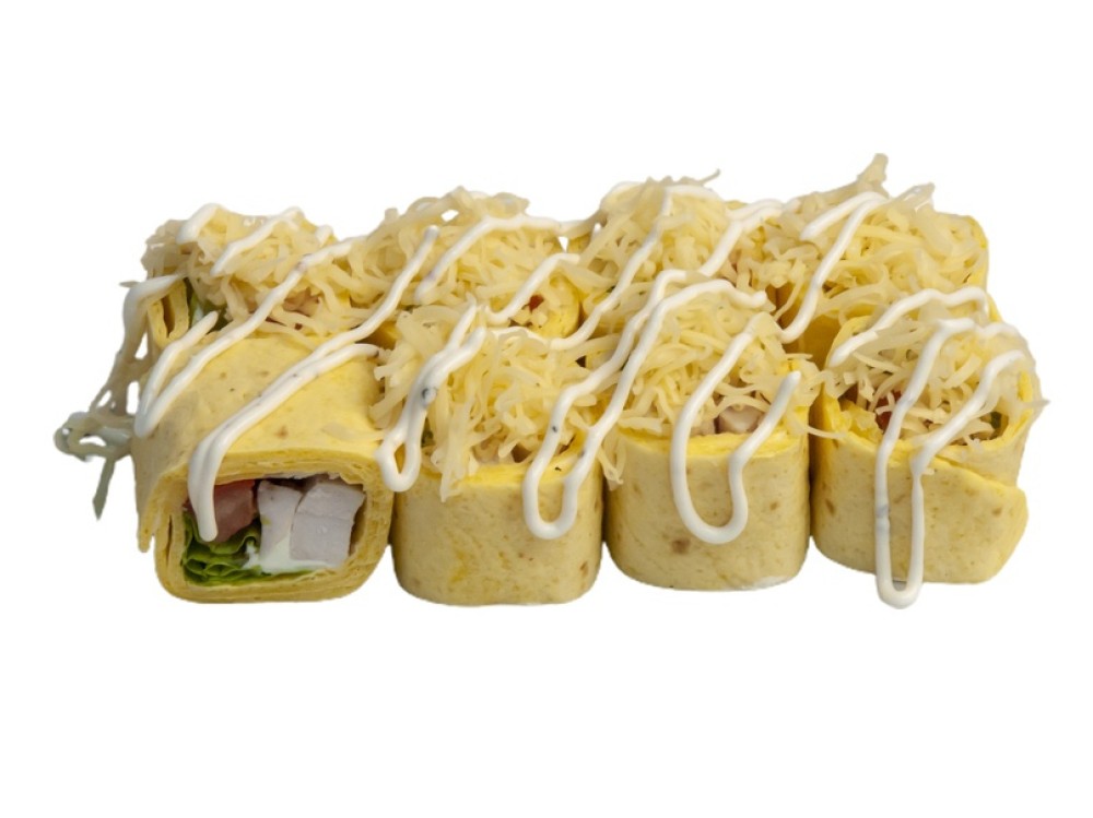 Сырная тортилья, запеченное куриное филе, лист салата, сливочный сыр, томаты, пармезан, соус цезарь