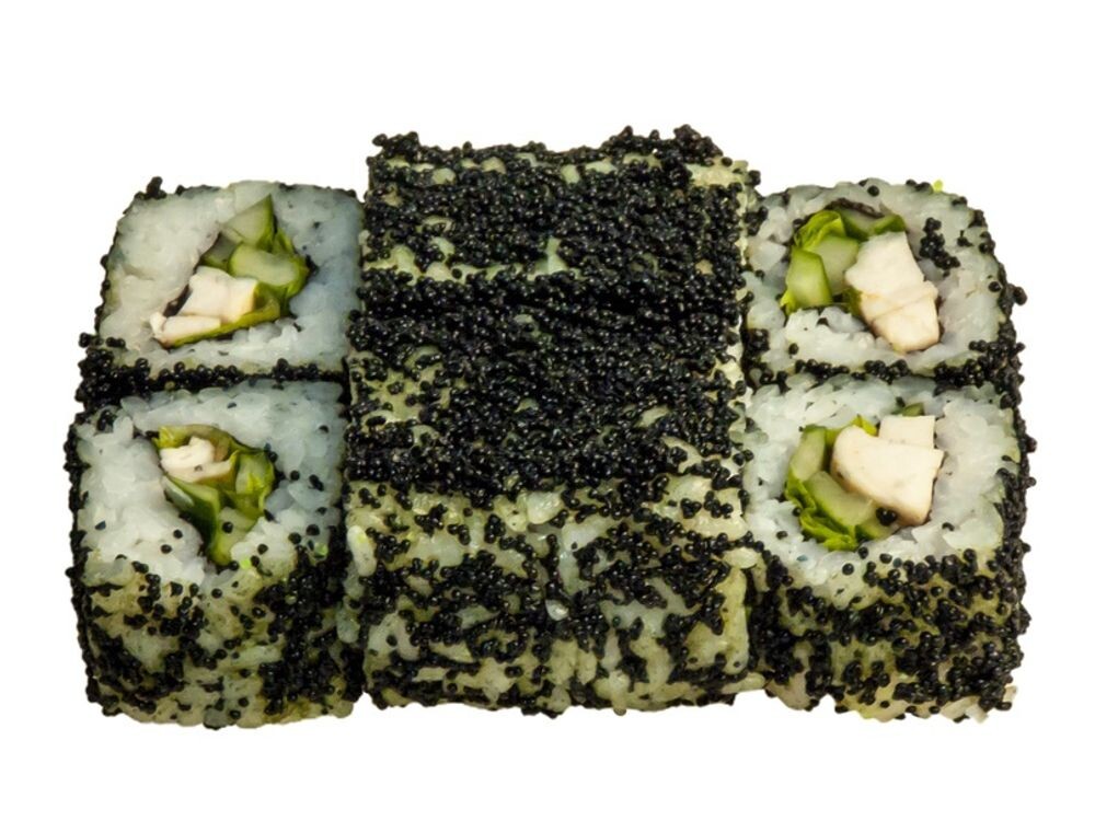 Рис, нори, запечённое куриное филе, соус Чили сладкий, огурец, салат айсберг, чёрная икра тобико