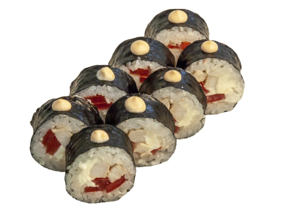 Нори, рис, запеченное куриное филе, сливочный сыр, томаты, спайси соус