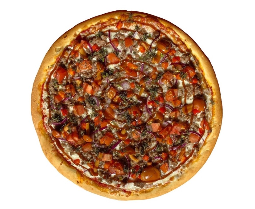 Томатный соус, сыр моцарелла, домашний фарш, лук красный, перец болгарский, опята, томаты, соус барбекю, укроп