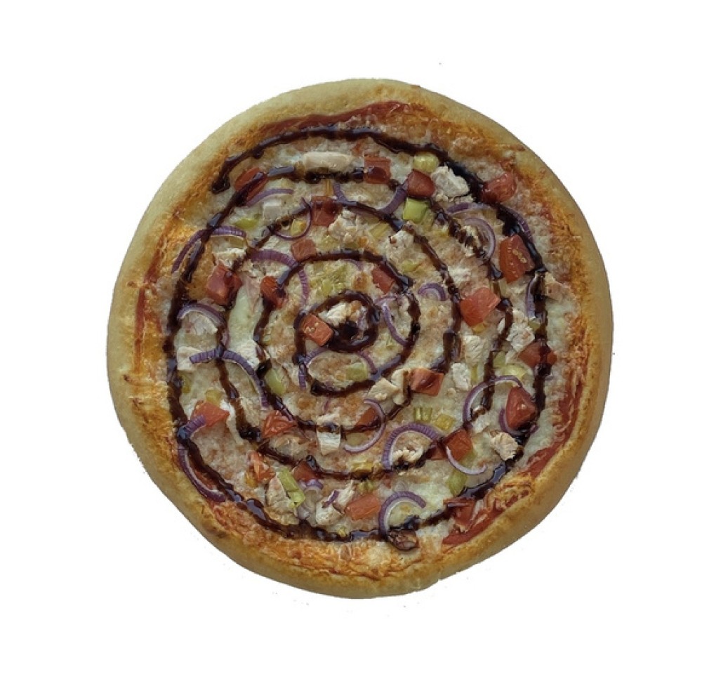 Фирменный соус, сыр Моцарелла, курица копчённая, болгарский перец, лук красный, томаты, соус терияки