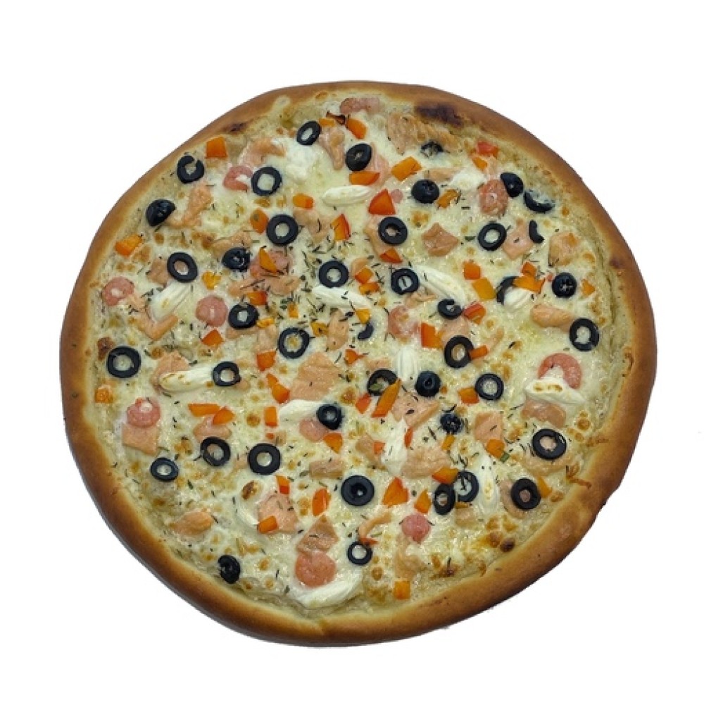 Тесто, сливки, грибной соус, сыр моцарелла, креветки, сёмга, сыр сливочный, маслины, перец болгарский, укроп