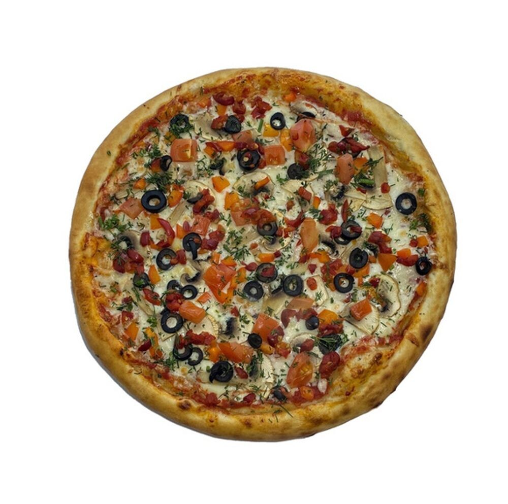 Тесто, фирменный соус, сыр моцарелла, шампиньоны, томаты, маслины, перец болгарский, укроп