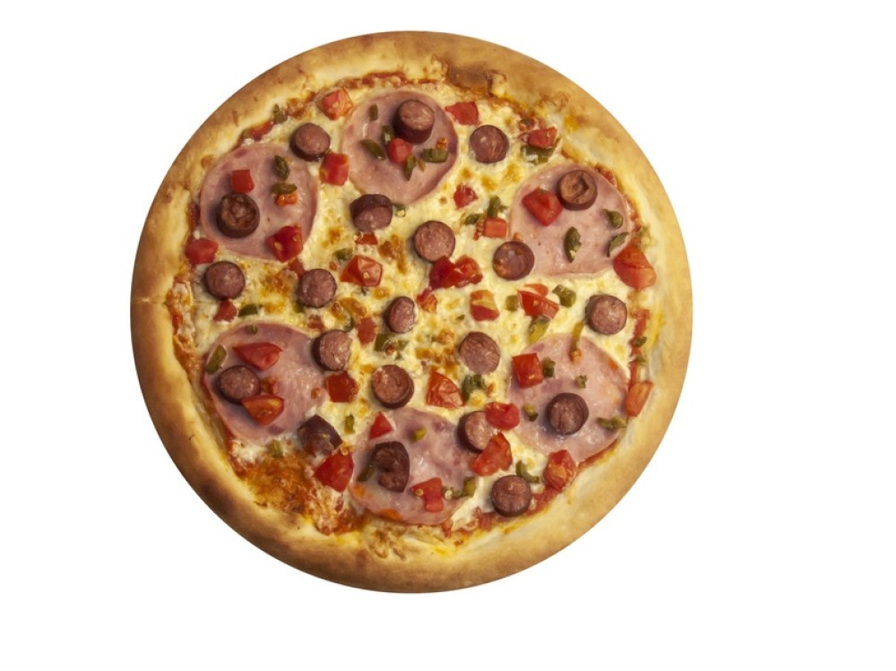 Соус томатный, сыр моцарелла, ветчина, охотничьи колбаски, томаты, халапеньо