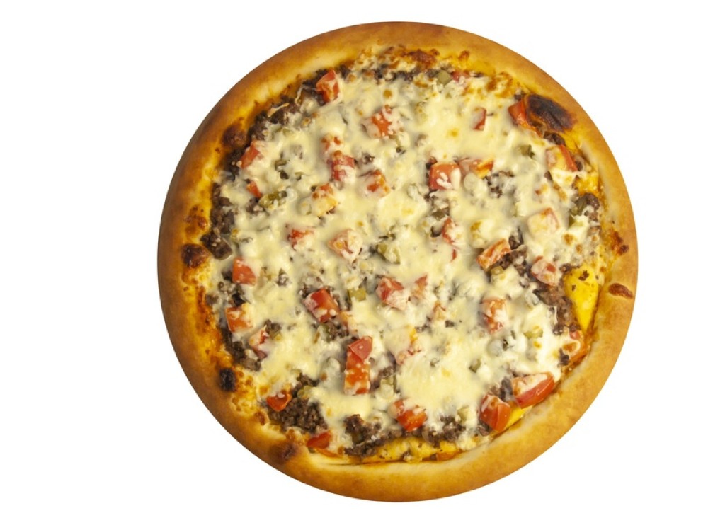 Соус фирменный, домашний фарш с луком, маринованные огурцы, томаты, сыр моцарелла