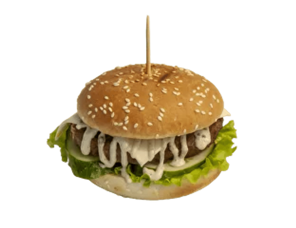 Булочка с кунжутом, говяжья котлета, сыр чеддар, лист салата, соус грибной, огурец