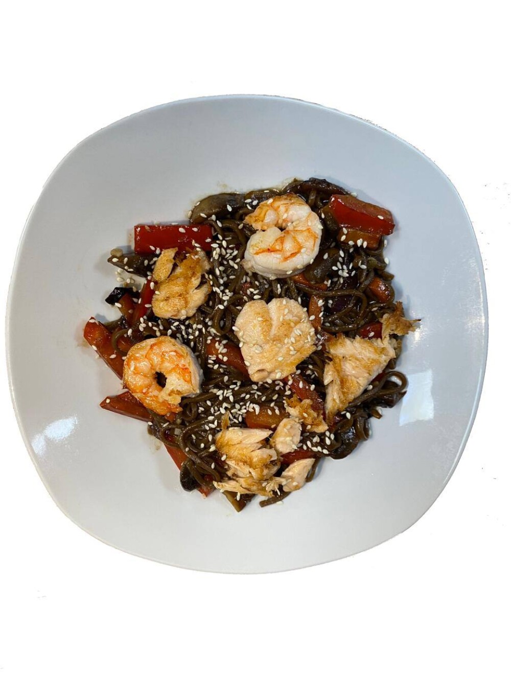 Лапша удон, тигровые креветки, лосось, болгарский перец, красный лук, морковь, грибы шампиньоны, соус терияки, чеснок, кунжут, кунжутное масло