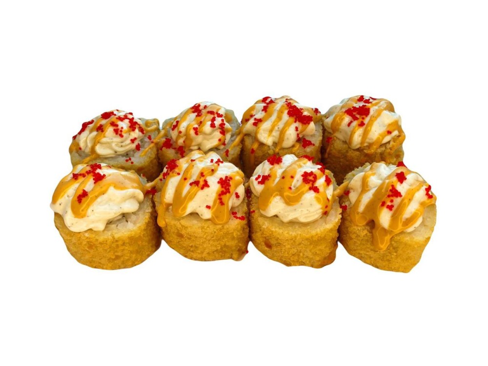 Рис, нори, сливочный сыр,, лосось, авокадо, кляр, панировочные сухарики, сырная шапочка, соус 1000 островов, красная масаго