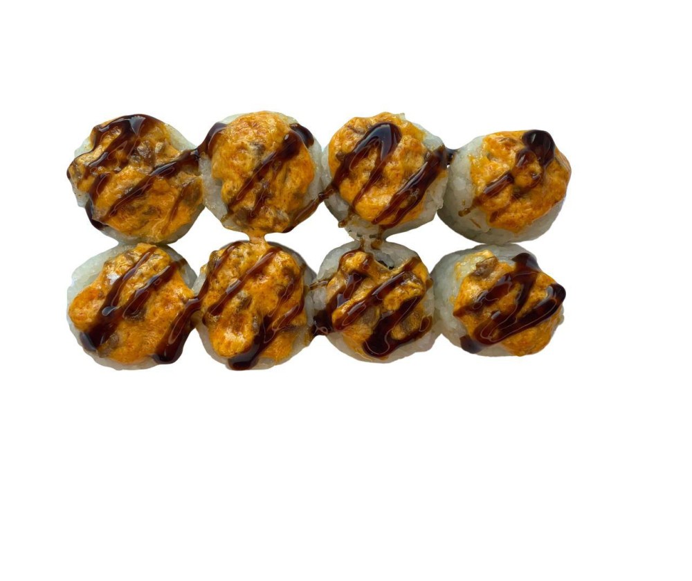 Рис, нори, сливочный сыр, темпурные тигровые креветки, лосось, соус спайси, соус терияки