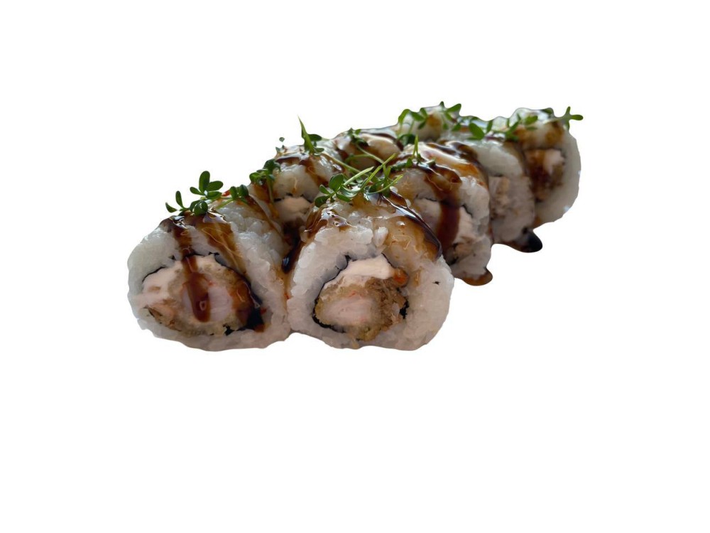 Рис, нори, сливочный сыр, темпурные тигровые креветки, соус сладкий чили, соус терияки