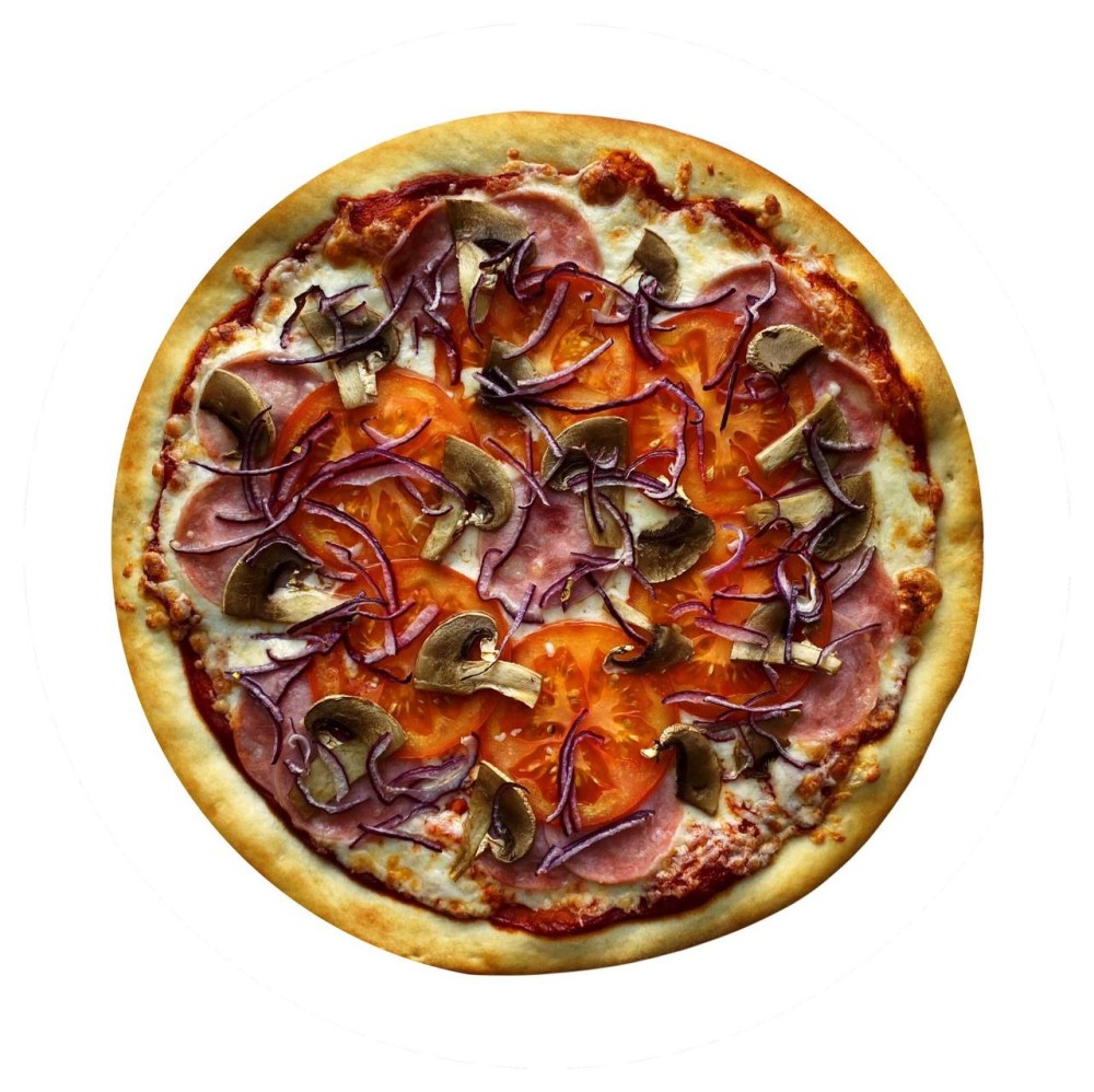 Тесто, томатный соус, моцарелла, ветчина, томаты, шампиньоны, красный, лук