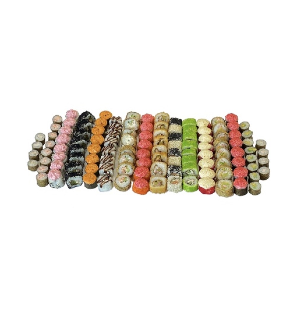 Ролл «Авокадо маки», ролл «Чикен маки», ролл «Кани маки», ролл «Шахматы», ролл «Темпурный» с беконом, ролл темпурный с креветкой, ролл темпурный «Филадельфия», ролл «Сенсей хот», ролл «Эби хот», ролл «Калифорния» с крабом хот, ролл «Монако хот», ролл «Сяке кунсей», ролл «Фудзи», ролл «Блек джек», ролл «Осуми»