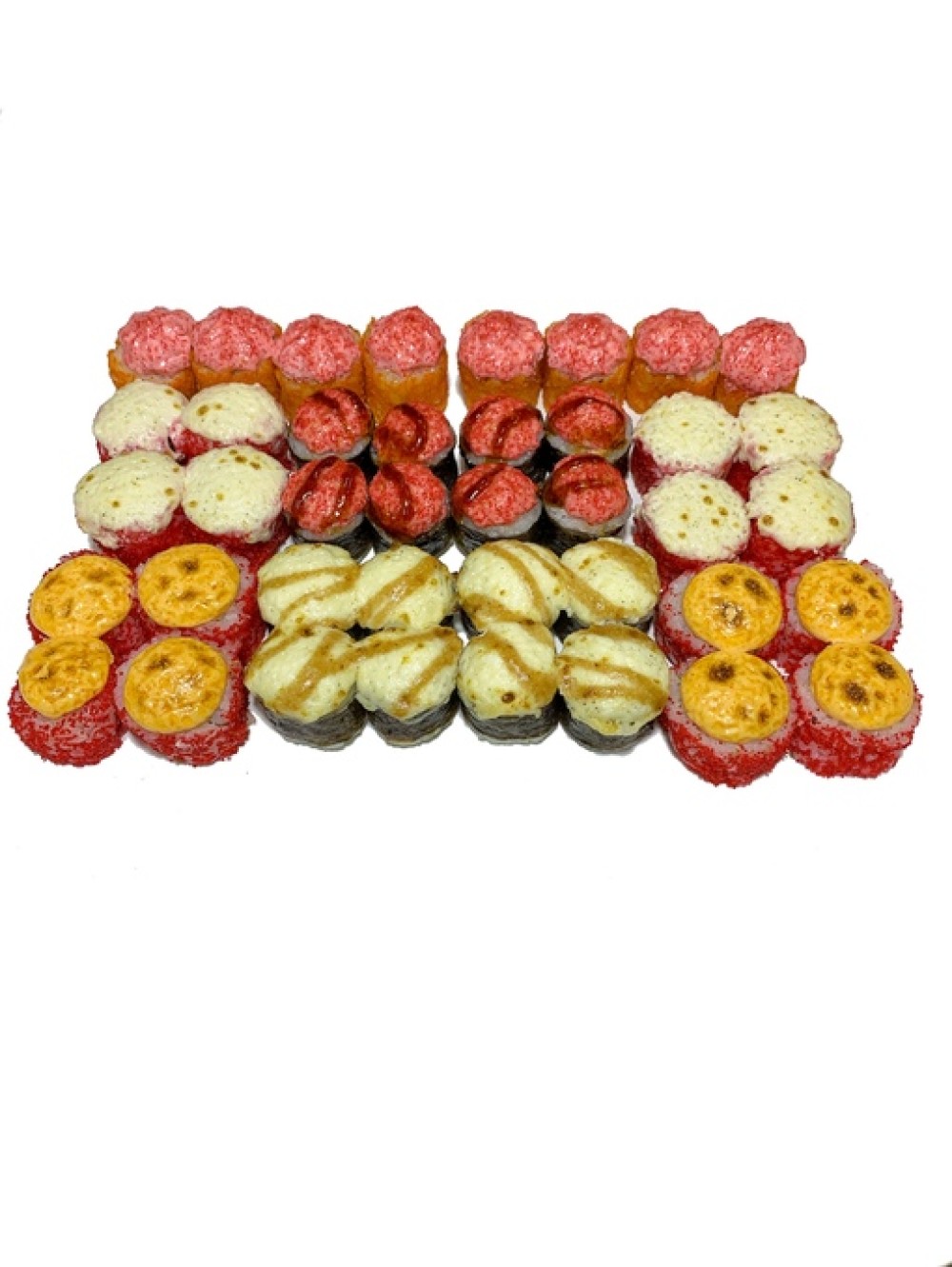 Ролл «Калифорния» с крабом хот, ролл «Калифорния» с лососем хот, ролл «Вулкан хот», ролл «Терияки хот», ролл «Монако хот» К сету прилагается два комплекта соевого соуса, имбиря, васаби, бамбуковые палочки