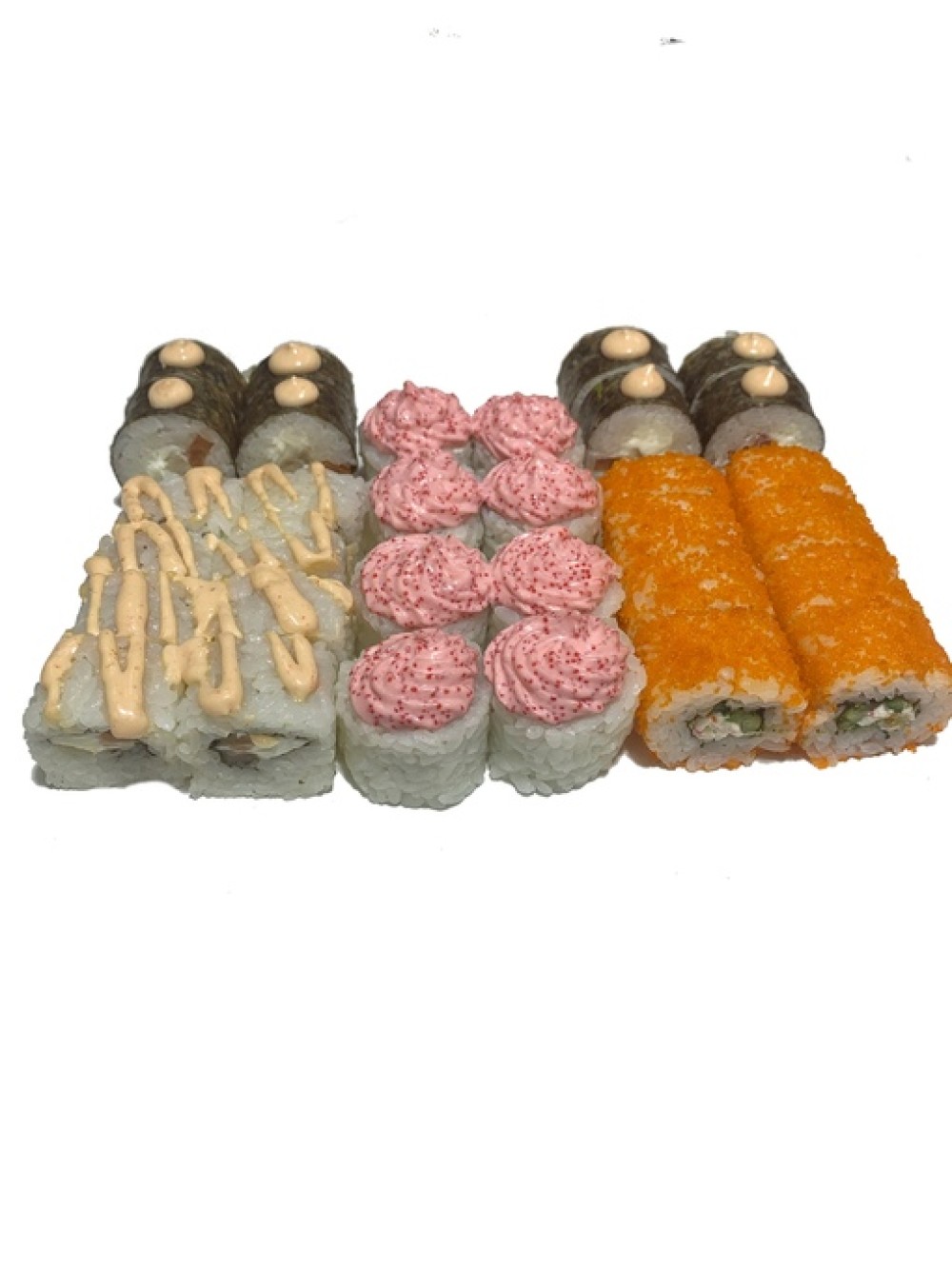Ролл «Сяке кунсей», ролл «Футомаки чикен», ролл «Лава» с креветкой, ролл «Калифорния» с крабом К сету прилагается два комплекта соевого соуса, имбиря, васаби, бамбуковые палочки