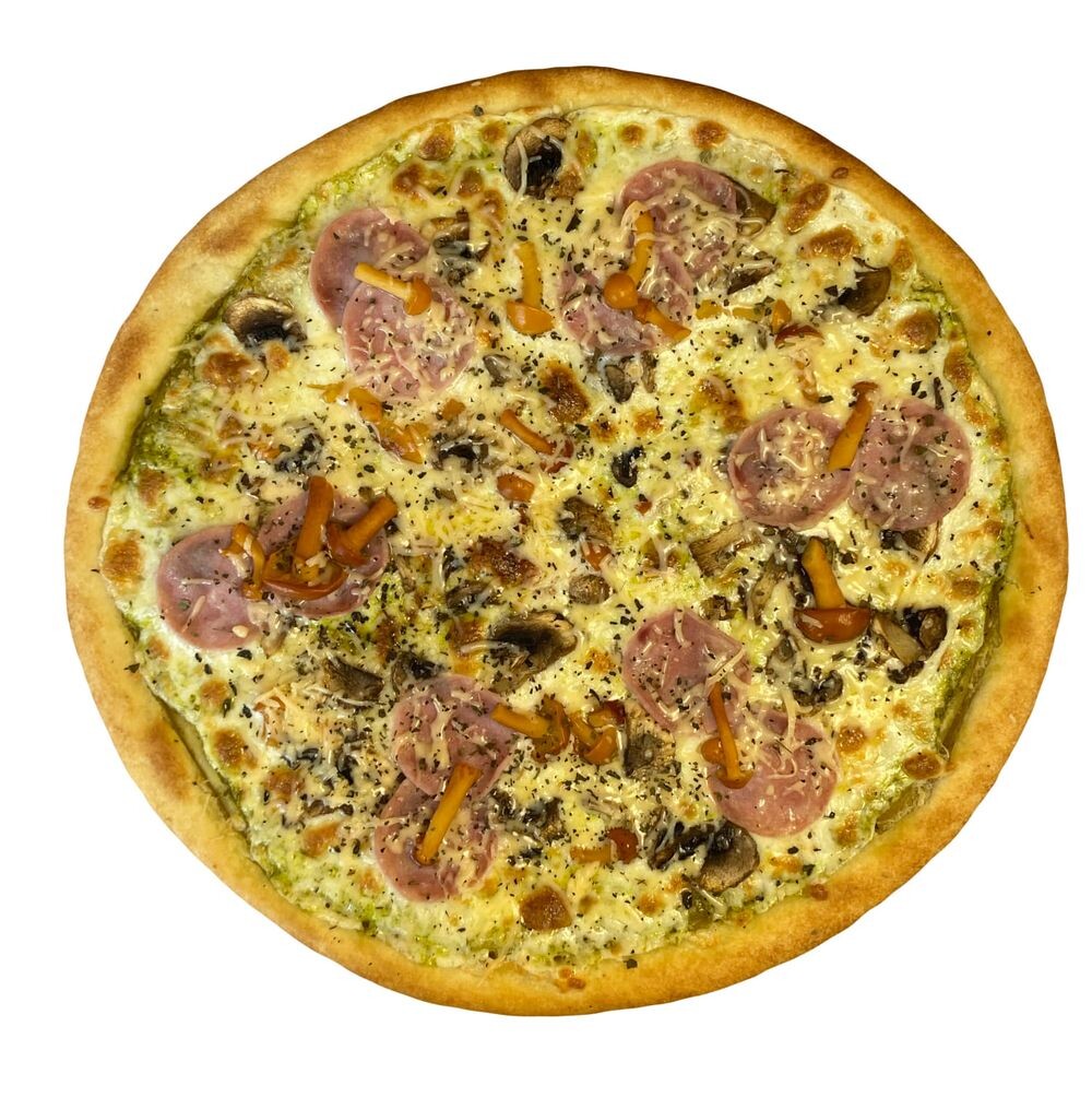 Тесто, соус чесночный , моцарелла, шампиньоны, ветчина, маринованные опята, пармезан, сушеный базилик