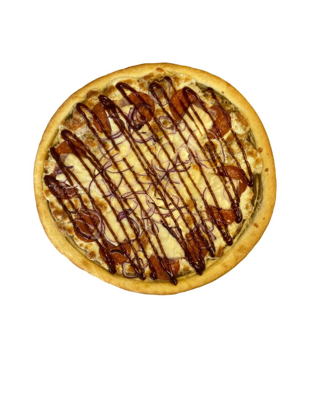 Тесто, соус грибной, моцарелла, колбаски пепперони, бекон, чеддер, красный лук, соус барбекю