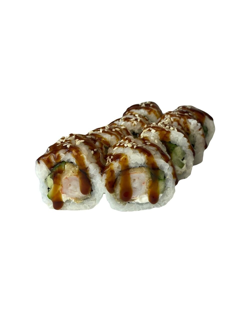 Рис. нори, сливочный сыр, огурец, темпурные тигровые креветки, соус унаги, кунжут белый