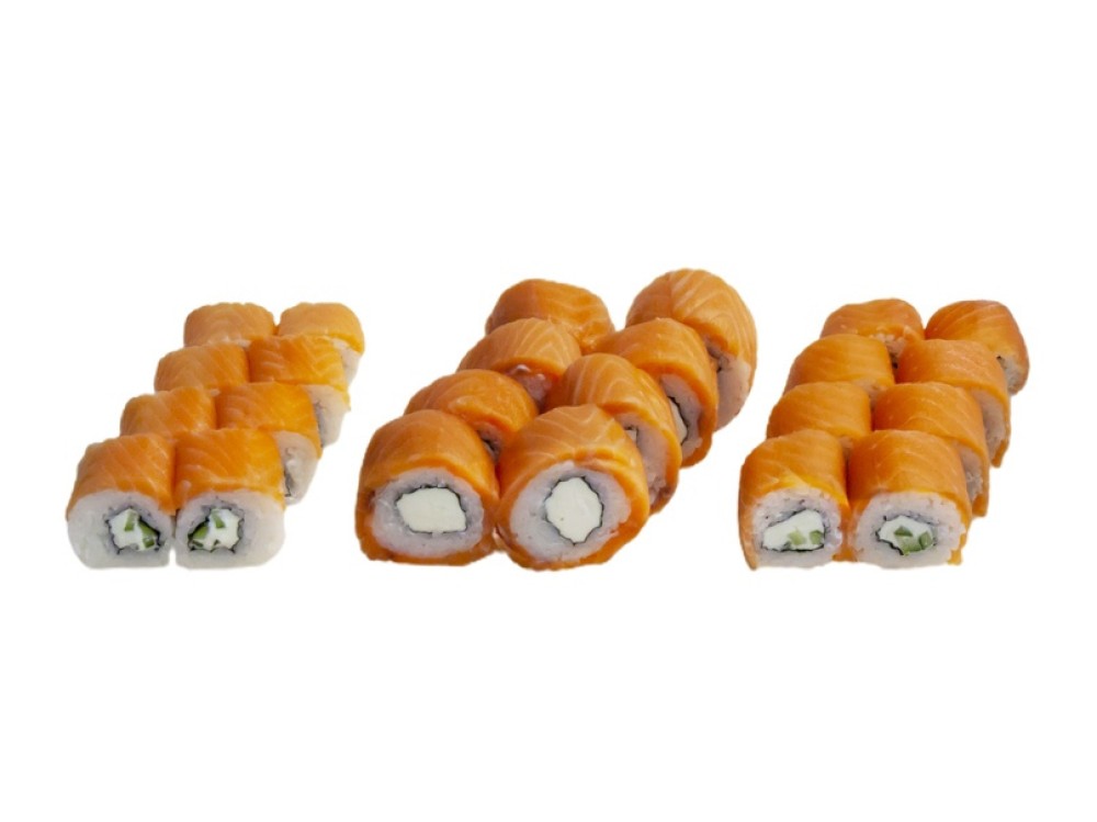 Ролл «Филадельфия» классическая, ролл «Филадельфия» лайт, ролл «Филадельфия» с огурцом К сету прилагается два комплекта соевого соуса, имбиря, васаби, бамбуковые палочки