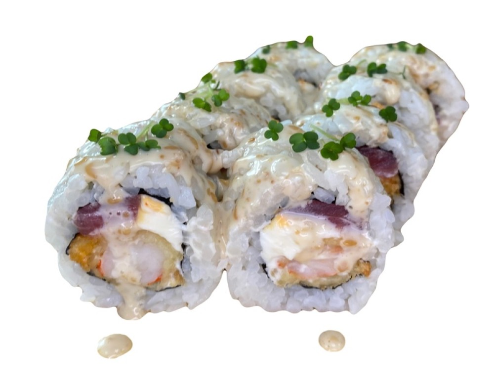 Нори, рис, темпурные креветки, сыр сливочный, тунец, спайси соус, ореховый соус